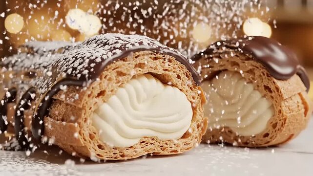 Filled with vanilla cream and chocolate glaze.